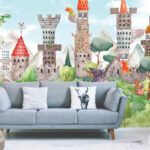 The Cherry Blossom Balloons mural is a whimsical illustration of pastel-toned hot air balloons floating among cherry blossoms, with adorable animals enjoying the ride. This artwork is an imaginative journey for a child, offering a sense of freedom and adventure. The soft pinks and light blues create a calming environment, nurturing a child’s ability to dream and imagine. Elements like fluffy clouds as pillows and a ceiling-hung balloon light fixture would complement this mural, turning a child’s room into a sky adventure.